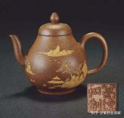 ▲葛德和陶器公司 泥绘山水纹紫砂壶